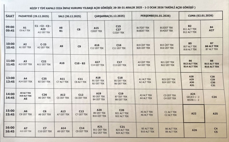 YILBAŞI açık görüşü 29.12.2025-02.01.2026 tarihleri arasında yapılacaktır.